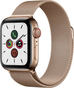 The Apple Watch Series 5 features an always-on Retina display and reliable performance for daily activity tracking, notifications, and health monitoring in a compact 40mm design. This watch comes with an aftermarket gold Milanese band.